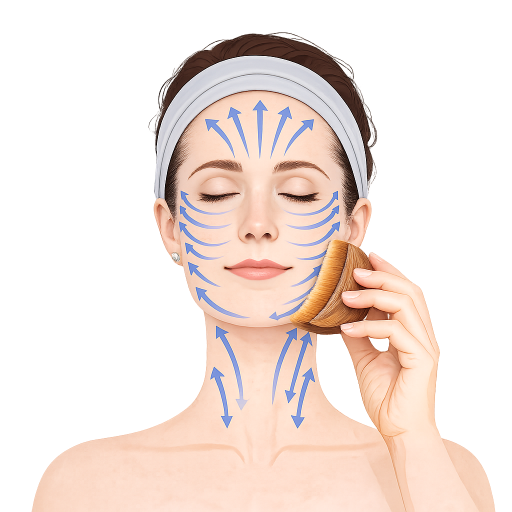 2. Le geste parfait : Brossez délicatement vers le haut, cou, mâchoire, joues, tempes, sous les yeux et front.